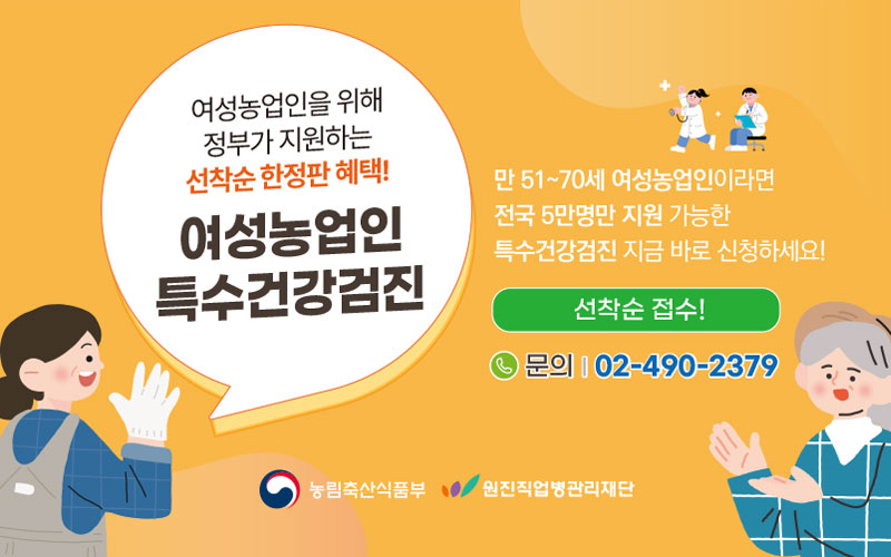 본 홈페이지 사업지역(사업지역 | 여성농업인 특수건강검진) 참고 및 관리기관(02-490-2379)로 연락주시기 바랍니다.
