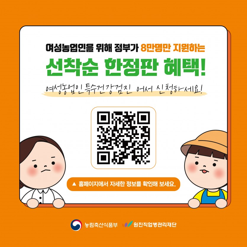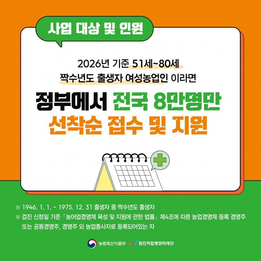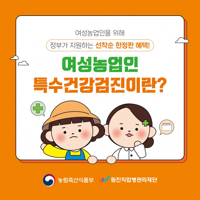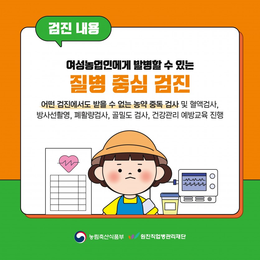 [카드뉴스] 2026년 여성농업인 특수건강검진 - 사업내용편 페이지 정보 작성자 원진직업병관리재단 댓글 0건 조회 64회 작성일 26-04-29 15:41 목록 본문 이전글[카드뉴스] 2026년 여성농업인 특수건강검진 - 신청안내편 26.04.29 다음글[홍보물] 2026년 여성농업인 특수건강검진 배너 시안 26.02.13 댓글 0 댓글목록 등록된 댓글이 없습니다.