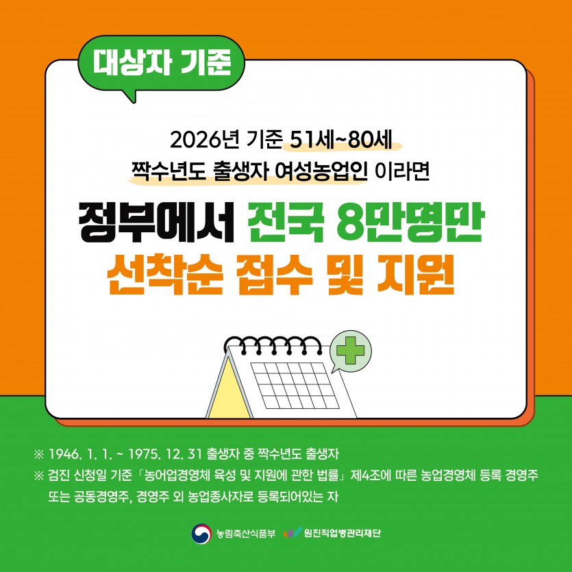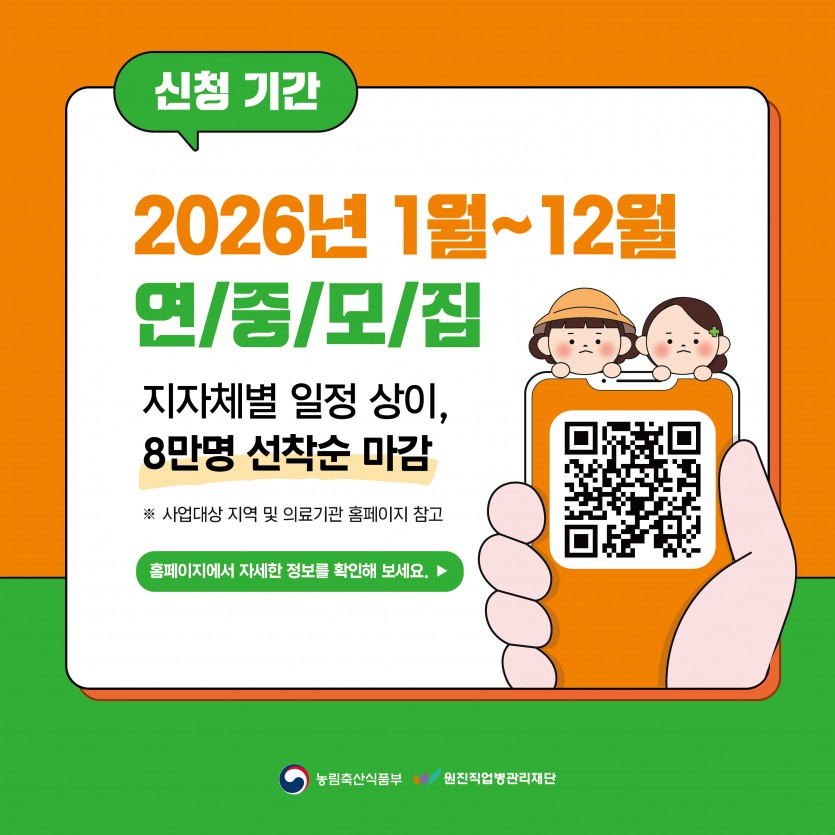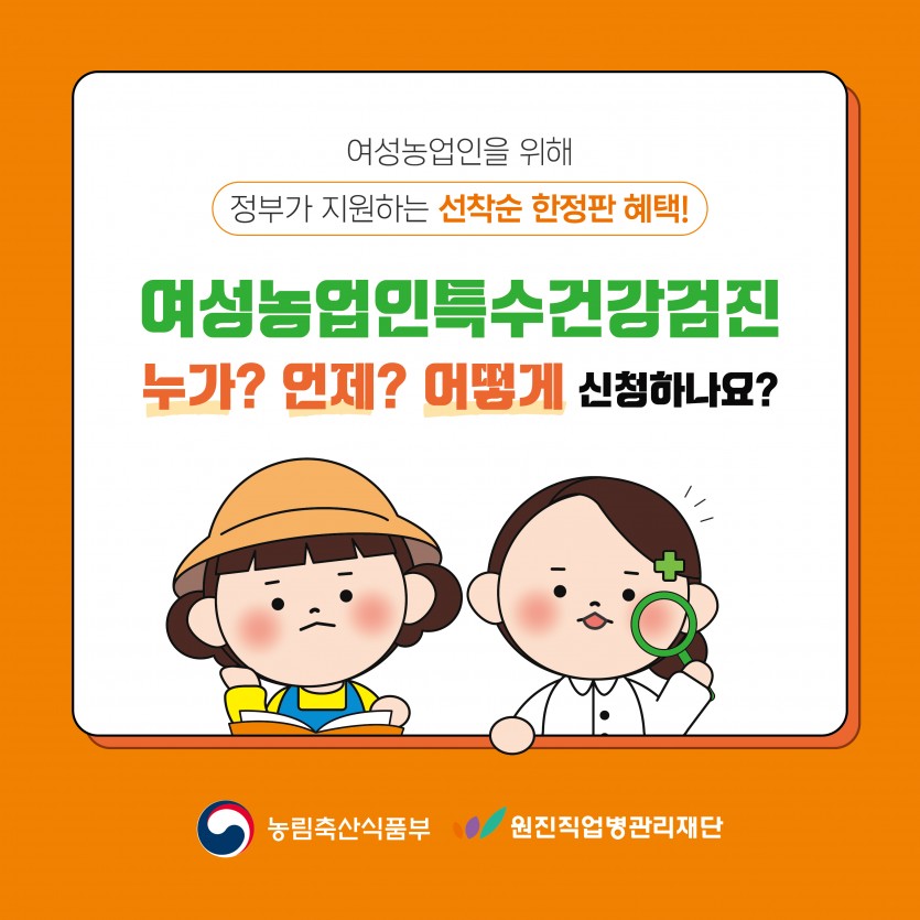 [카드뉴스] 2026년 여성농업인 특수건강검진 - 신청안내편 페이지 정보 작성자 원진직업병관리재단 댓글 0건 조회 45회 작성일 26-04-29 15:45 목록 본문 이전글[카드뉴스] 2026년 여성농업인 특수건강검진 - 혜택안내편 26.04.29 다음글[카드뉴스] 2026년 여성농업인 특수건강검진 - 사업내용편 26.04.29 댓글 0 댓글목록 등록된 댓글이 없습니다.